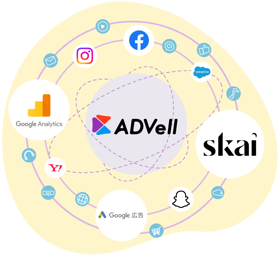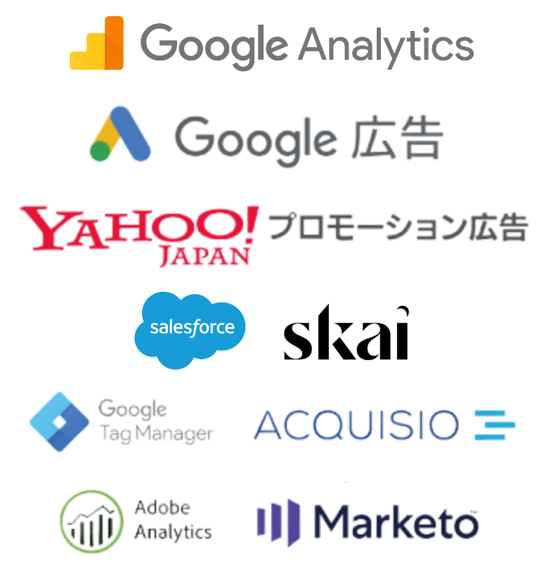 GoogleAnalyticsなどのアクセス解析・Skai(旧Kenshoo)などの広告運用ツール・SalesforseなどのCRMツールとも媒体連携しています。